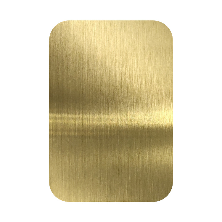 Đây là một tấm thép không gỉ trang trí kết thúc đường tóc trong lớp phủ màu vàng champagne PVD. Nó chủ yếu được làm bằng tấm thép không gỉ cấp 201 304 316 hoặc 430.Bề mặt của nó được thực hiện bằng quá trình chải và quá trình sơn màu PVD, mà làm cho bề mặt của nó hiện có kết cấu tóc và hiệu ứng màu ngọc lam. Bảng thép không gỉ này chủ yếu được sử dụng cho trang trí tường. Chúng tôi cũng có thể thêm công nghệ chống vân tay trên nó,để các bức tường của chúng tôi có thể không chỉ có một cái nhìn đẹp mà còn có một kết cấu cao cấp.